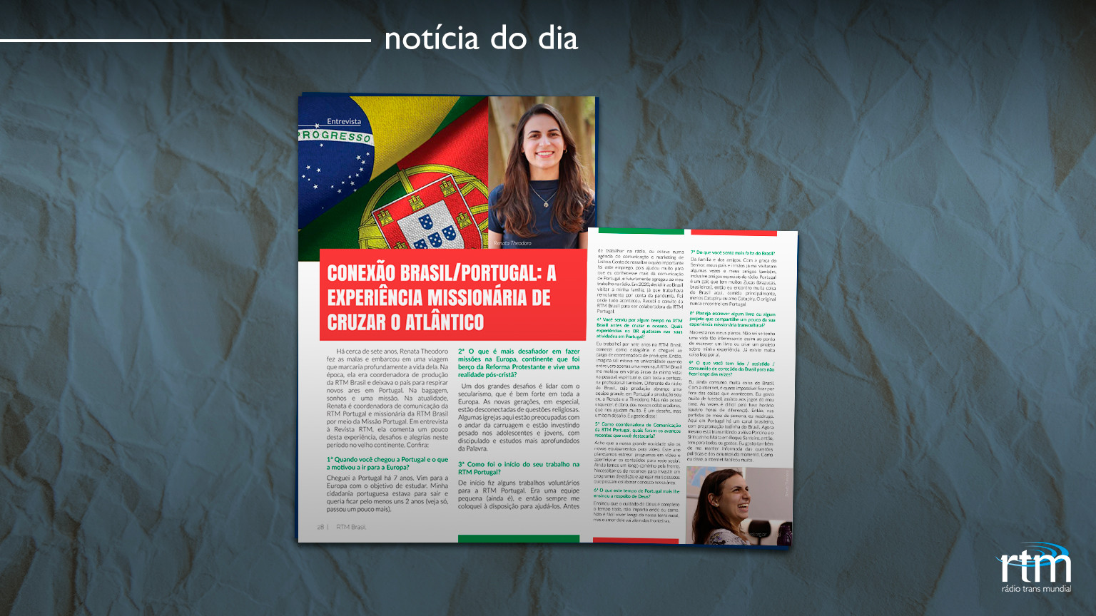 Há cerca de sete anos, Renata Theodoro fez as malas e embarcou em uma viagem que marcaria profundamente a vida dela. Na época, ela era coordenadora de produção da RTM Brasil e deixava o país para respirar novos ares em Portugal. Na bagagem, sonhos e uma missão. Na atualidade, Renata é coordenadora de Ccomunicação da RTM Portugal e missionária da RTM Brasil por meio da Missão Portugal. Em entrevista à Revista RTM, ela comenta um pouco desta experiência, desafios e alegrias neste período no velho continente. Confira: