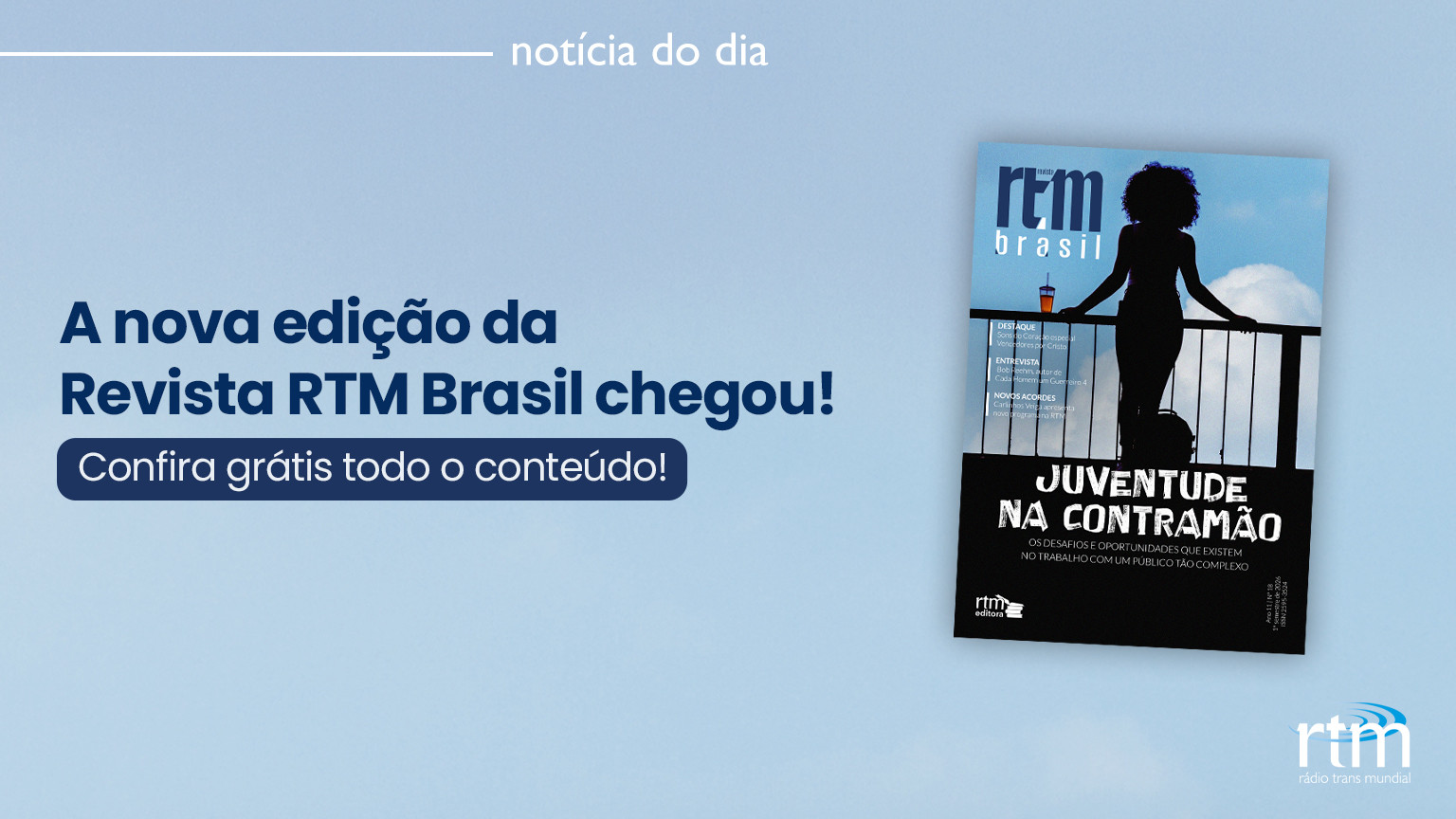 A RTM lança nesta quarta (11) a edição 18 da Revista RTM Brasil. Por enquanto, o conteúdo está disponível na versão digital e pode ser acessado pelo site da missão de forma gratuita. A reportagem de capa fala sobre a juventude brasileira e os esforços da Trans Mundial em produzir conteúdo que dialogue com essa faixa etária por meio do ministério Na Contramão.